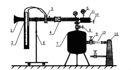 1-入口段 2-U型管壓差計(jì) 3-孔板流量計(jì) 4-噴管試驗(yàn)段 5-真空表6-支撐架 7-穩(wěn)壓罐 8、9-調(diào)節(jié)閥 10-真空泵  11-探針自動(dòng)移動(dòng)機(jī)構(gòu)  12-探針手動(dòng)移動(dòng)機(jī)構(gòu)(手槍) 13-橡膠接管