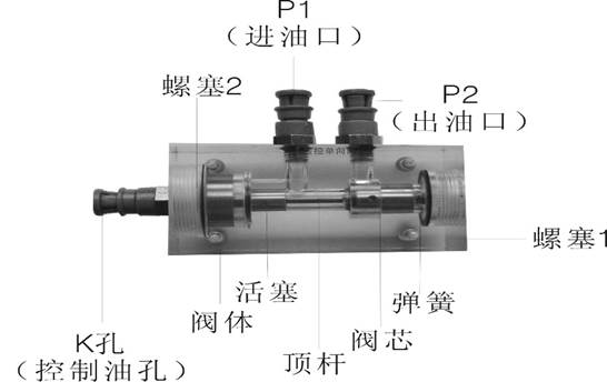 2、液控單向閥結(jié)構(gòu)上參考了國產(chǎn)ⅠY-25B型板式單向閥,其閥體,螺塞等采用了進口透明有機玻璃材料精制而成,閥芯采用了45#中碳鋼材料,并配合彈簧,油接頭,密封圈等標準件裝配而成,通過它可明確地觀察到活塞、彈簧、油孔等結(jié)構(gòu)及其運行過程,具有形象逼真,性能可靠等優(yōu)點。它既可作為教學模型,也可作為液壓實驗元件進行實驗演示。