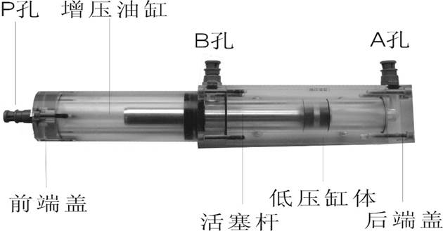 2、增壓油缸的前端蓋、后端蓋、低壓缸體、增壓缸體等均采用了進口透明有機玻璃材料精制而成,透明清晰,活塞桿采用了合金鋁材料,并配合油接頭,密封圈,內(nèi)六角螺絲等標準件裝配而成,通過它可明確地觀察到活塞桿,油封,油孔等結(jié)構(gòu)及其運行過程,具有形象逼真,性能可靠等優(yōu)點,它既可作為教學模型,也可以液壓實驗元件進行實驗演示。