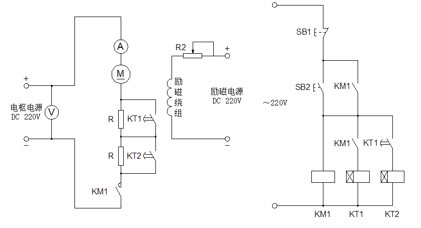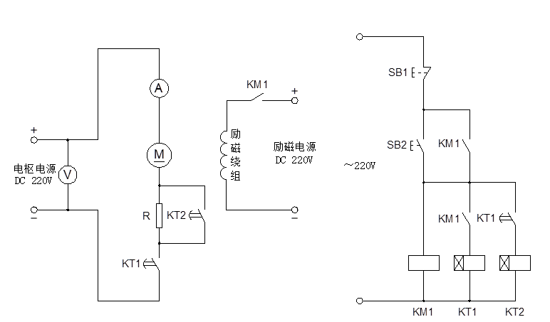 按下控制屏上的“啟動(dòng)”按鈕,將直流電樞電源開(kāi)關(guān)打到開(kāi)的位置,調(diào)節(jié)電樞電源的“電壓調(diào)節(jié)”旋鈕,使直流電壓輸出為220V,斷開(kāi)電源開(kāi)關(guān),按下“停止”按鈕;將時(shí)間繼電器KT1和KT2分別設(shè)定為3S和5S。按圖5-1接線,交流220V接至控制屏的固定輸出端U1和N1。R為DQ29上180Ω阻值,測(cè)量?jī)x表選用DQ22上電壓表300V檔和安培表5A檔,電機(jī)用DQ09。檢查接線電路,無(wú)誤后按下面步驟操作: