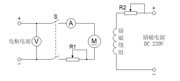 按下控制屏上的“啟動(dòng)”按鈕,打開(kāi)電樞電源開(kāi)關(guān),調(diào)節(jié)電樞電源的“電壓調(diào)節(jié)”旋鈕,使直流電樞電壓輸出為220V,按下“停止”按鈕。按圖5-5接線,圖中電阻R1為DQ29上180Ω并將其為最大位置,R2為DQ29上1800Ω阻值并將其置最小位置,S選用屏上雙刀雙擲開(kāi)關(guān),開(kāi)始時(shí)處于斷開(kāi)狀態(tài)。