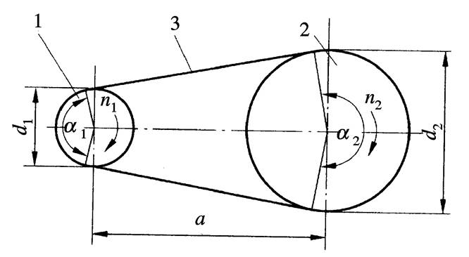 摩擦型帶傳動通常由主動輪、從動輪和傳動帶組成。傳動帶以一定的初拉力F0緊套在帶輪上,在F0的作用下,帶與帶輪的接觸面間產(chǎn)生正壓力,當(dāng)主動輪1回轉(zhuǎn)時,接觸面間產(chǎn)生摩擦力,主動輪靠摩擦力使傳動帶3與其一起運動。同時,傳動帶靠摩擦力驅(qū)使從動輪2與其一起轉(zhuǎn)動,從而主動軸上的運動和動力通過傳動帶傳遞給了從動軸。