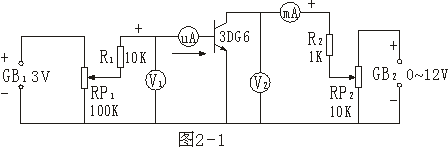 1、按圖2-1接線,V1用萬(wàn)用表,V2用15V表頭,微安表用100μA表頭,三極管用3DG6。