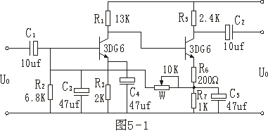 大器電壓放大倍數(shù),然后將三極管電極電阻換為10KΩ,測量輸入和輸出電壓,再將集電極電阻換為3.3KΩ,負載電阻換為2.7KΩ,測量輸入和輸出電壓。