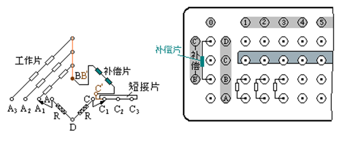 試件上的貼片情況(見圖5-4),其中對應正反面的應變片已兩兩串聯連接。另有一補償塊,補償塊上共粘貼了四片應變片,其中綠色線為兩片應變片串聯連接線。