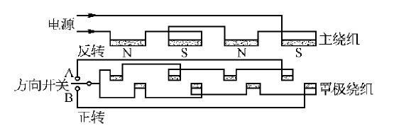 在隱極式罩極電動機中,可以正反方向運轉(zhuǎn),這種可逆電動機的定子槽中必須具有一套主繞組與兩套罩極繞組,其極數(shù)相同。當電動機朝一個方向旋轉(zhuǎn)時,只有一套罩極繞組起作用。