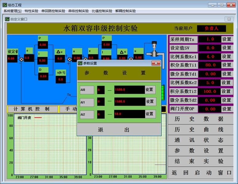 9.點擊“確認”,用戶登錄完畢。選擇“串級控制實驗”下拉菜單中的“雙容串級控制實驗”。出現(xiàn)如下的“水箱雙容串級控制實驗”界面。