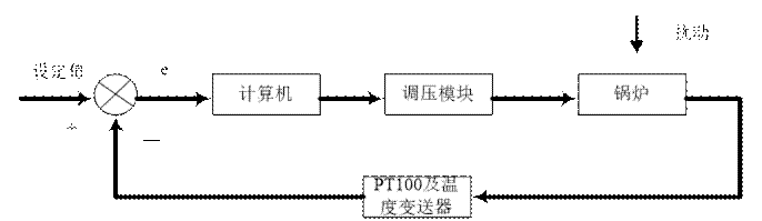 本實驗將鍋爐的水溫控制在設(shè)定溫度。根據(jù)加熱器溫度變送輸出給儀表,進(jìn)行PID運算,然后控制輸出信號。通過調(diào)壓模塊,調(diào)整電加熱器的功率,使得鍋爐里水溫控制在設(shè)定的溫度。鍋爐溫度控制的方塊原理圖:如圖3-11所示