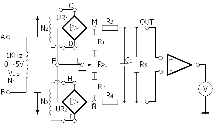 傳感器的兩個(gè)次級(jí)線圈(N2、N3)電壓分別經(jīng)UR1、UR2兩組橋式整流電路變換為直流電壓,然后相減,經(jīng)過(guò)差動(dòng)放大器放大后,由電壓表顯示出來(lái)。R1、R2為兩橋臂電阻,RP1為調(diào)零電位器,R3、R4、C1組成濾波電路,R5為負(fù)載電阻,采用這種差動(dòng)整流電路可以減少零點(diǎn)殘余電壓。