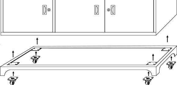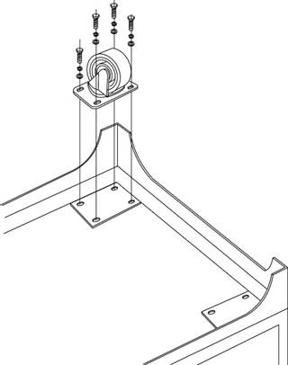② 將桌體翻轉(zhuǎn),圍板與萬向輪一同安裝到實(shí)驗(yàn)臺桌身,注意孔位對齊。按照右圖所示