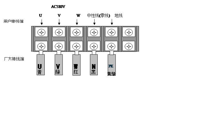 用一條5芯護(hù)套線作為電源線,每條線芯不得低于1mm2。按照圖的順序引入電源線。電源線另一頭可以選用公司配方的三相插頭,但地線(PE)需要單獨(dú)接地。