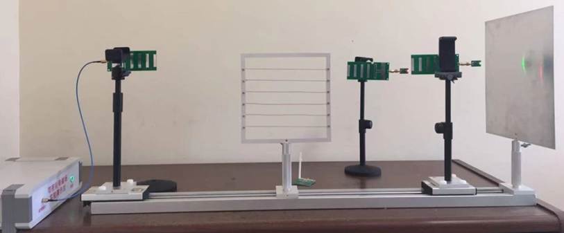 隨時變化的電場在空間產(chǎn)生磁場,同樣,隨時間變化的磁場也要在空間產(chǎn)生電場,電場和磁場構(gòu)成統(tǒng)一的電磁場的兩個不可分割的部分。能夠輻射電磁波的裝置稱為天線,用功率信號發(fā)射器作為發(fā)射源,通過發(fā)射天線產(chǎn)生電磁波,如果將另一副天線置于電磁波中,就能夠在天線體上感生高頻電流,接收天線離發(fā)射天線越近,電磁波功率越強,感應電動勢越大。接收天線接收的功率足夠強時,大于5dBm時,肖特基檢波二極管將微波能量轉(zhuǎn)變?yōu)橹绷麟妷,終端接上LED燈,電壓達到一定值時可以點亮LED燈,形象直觀的觀察發(fā)射天線的方向圖、主瓣、副瓣、后瓣、零點方向、極化等。放大頻率范圍:2350MHz~2450MHz最大輸出功率27dBm,發(fā)射天線有四種類型,垂直極化、水平極化、左旋圓極化、右旋圓極化;增益:>10dBi,在現(xiàn)有配置情況下,最遠可以在170cm處點亮,距離越近燈越亮。也可以將不同的LED組合使用,但點亮距離會稍微減小。