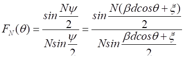 天線陣的總輻射場等于位于原點的陣單元輻射的場乘上一個因子,這個因子的出現(xiàn)是由兩個電流元排列成天線陣而出現(xiàn)的,稱陣因子。歸一化陣因子方向圖函數(shù)可以表示為:
