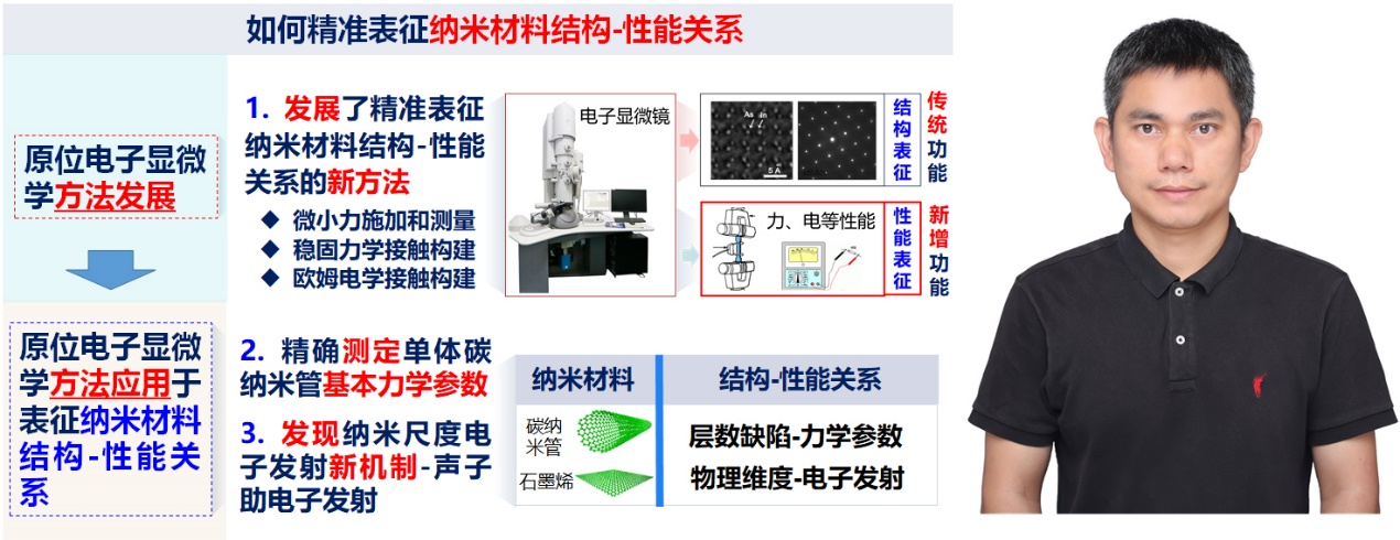 如何精準(zhǔn)建立納米材料的結(jié)構(gòu)-性能關(guān)系是低維納米材料研究的一個(gè)關(guān)鍵問題。納米材料具有性能對(duì)結(jié)構(gòu)和環(huán)境敏感、不同個(gè)體樣品之間結(jié)構(gòu)和性能經(jīng)常不同等特點(diǎn),基于不同樣品、不同設(shè)備分別表征結(jié)構(gòu)和性能的傳統(tǒng)方法難以精準(zhǔn)建立納米材料的結(jié)構(gòu)-性能關(guān)系。為此,本項(xiàng)目發(fā)展了一系列原位電子顯微學(xué)方法,解決了如何在電子顯微鏡中精確表征單體納米材料的力學(xué)、電學(xué)等物理性能的問題,實(shí)現(xiàn)了在同一設(shè)備環(huán)境下針對(duì)同一單體納米材料同時(shí)表征結(jié)構(gòu)和性能,提供了精準(zhǔn)表征納米材料結(jié)構(gòu)-性能關(guān)系的新方法,并通過此方法進(jìn)一步揭示了碳納米管、石墨烯等重要納米材料的結(jié)構(gòu)-性能關(guān)系,包括:精確測(cè)定了單體碳納米管的多個(gè)基本力學(xué)參數(shù),建立了力學(xué)參數(shù)與結(jié)構(gòu)的關(guān)系;在低維碳納米材料中發(fā)現(xiàn)了聲子助電子發(fā)射新機(jī)制,建立了物理維度與熱電子發(fā)射的關(guān)系等。研究成果為相關(guān)納米材料在納米電子器件等領(lǐng)域的應(yīng)用提供了重要結(jié)構(gòu)-性能關(guān)系的支撐,共發(fā)表SCI論文80余篇,5篇代表作共被SCI他引600余次。