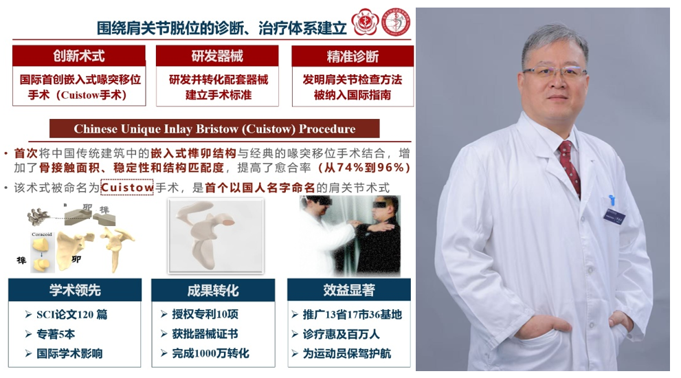 (1)開發(fā)了創(chuàng)新手術(shù)技術(shù)——“嵌入式喙突移位術(shù)”。這一創(chuàng)新靈感來自于中國傳統(tǒng)建筑的榫卯結(jié)構(gòu),將其用于喙突移位手術(shù),增加了骨塊接觸面積、穩(wěn)定性和結(jié)構(gòu)匹配度,使骨愈合率得到極大改善。這一術(shù)式成為首個(gè)以中國人名字命名的肩關(guān)節(jié)脫位手術(shù):Cuistow手術(shù)。