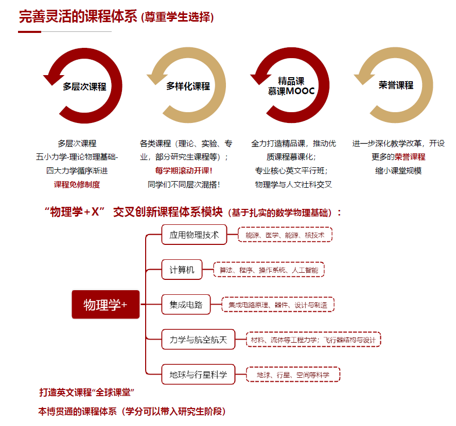 學(xué)院構(gòu)建了“全覆蓋、模塊化、分層次”課程體系。在專業(yè)基礎(chǔ)課程上,學(xué)院實施模塊化教學(xué)。普通物理、理論物理等核心課程均在模塊內(nèi)設(shè)置了深度、難度、廣度不同的兩類課程,為學(xué)生的自由發(fā)展提供了制度保障和選擇權(quán)。同時,學(xué)院還將所有研究生核心課程及必修課程對本科生開放,全面實施本科生-研究生課程貫通模式,并可以選擇把學(xué)分帶到研究生學(xué)習(xí)階段。
