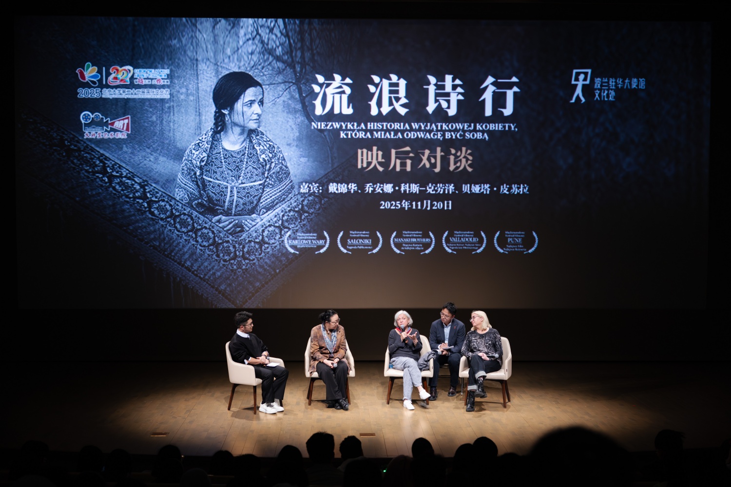 11月20日晚,一場跨越文明的詩意對話在北京大學(xué)百周年紀(jì)念講堂李瑩廳舉行。作為第二十二屆國際文化節(jié)的系列活動,波蘭電影《流浪詩行》映后對談活動由會議中心與國際合作部共同主辦,并得到波蘭駐華大使館文化處的大力支持。北京大學(xué)中國語言文學(xué)系教授戴錦華與影片導(dǎo)演喬安娜·科斯-克勞澤(Joanna Kos-Krauze)、編劇貝婭塔·皮蘇拉(Beata Pisula)共聚一堂,圍繞電影藝術(shù)、文化認同與跨文明理解展開深邃交流,共同挖掘“流浪”背后的多元意涵。