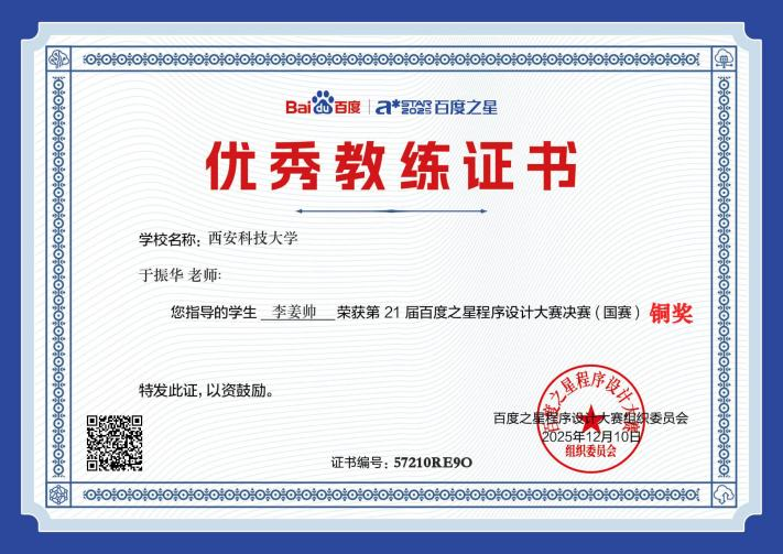 決賽當(dāng)天,李姜帥同學(xué)沉著冷靜、從容應(yīng)戰(zhàn),面對復(fù)雜的競賽題目,迅速理清解題思路,高效完成程序編寫與調(diào)試。憑借清晰的邏輯架構(gòu)、規(guī)范的代碼實現(xiàn)與合理的時間分配,最終成功躋身銅獎行列,實現(xiàn)了西安科技大學(xué)在百度之星程序設(shè)計大賽中的歷史性突破,也是學(xué)校“以賽促學(xué)、以賽促練” 人才培養(yǎng)模式的生動實踐。