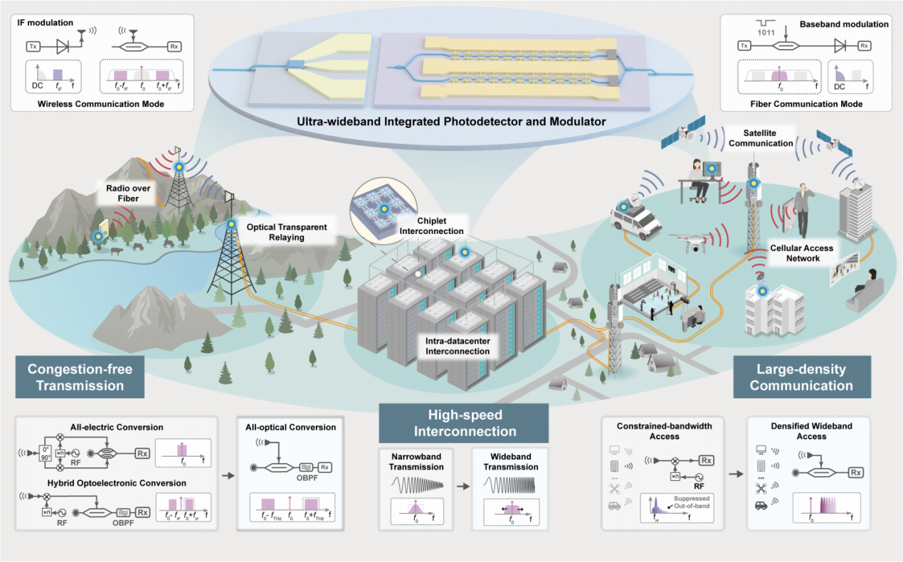 近年來,隨著AI技術(shù)的快速發(fā)展,更高密度、更高性能算力成為未來人工智能領(lǐng)域競爭中的關(guān)鍵一環(huán)。如何實現(xiàn)算力芯片間及大規(guī)模數(shù)據(jù)中心內(nèi)更高速的互聯(lián)成為制約算力資源發(fā)展的重要瓶頸。與此同時,星地通訊、智能網(wǎng)聯(lián)汽車等日益增長的泛在接入需求對以太赫茲(THz)通信為代表的下一代移動通信技術(shù)提出了更高容量和更低時延的挑戰(zhàn)。此外,面向未來“萬物互聯(lián)”時代,一個電信通訊網(wǎng)絡中的長期痛點也愈發(fā)突出:光纖通信與無線通信在信號架構(gòu)與硬件約束上存在帶寬鴻溝,阻礙了統(tǒng)一的系統(tǒng)設計,導致兩者難以在同一套基礎設施上實現(xiàn)高速且兼容的端到端傳輸。
