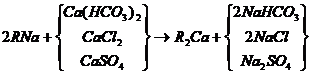 當含有鈣鹽及鎂鹽的水通過裝有陽離子交換樹脂的交換器時,水中的Ca2+及Mg2+便與樹脂中的可交換離子(Na+或H+)交換,使水中Ca2+、 Mg2+含量降低或基本上全部去除,這個過程叫做水的軟化。樹脂失效后要進行再生,即把樹脂上吸附的鈣、鎂離子置換出來,代之以新的可交換離子。鈉離子交換用食鹽(NaCl)再生、氫離子交換用鹽酸(HCl)或硫酸(H2SO4)再生;痉磻饺缦。