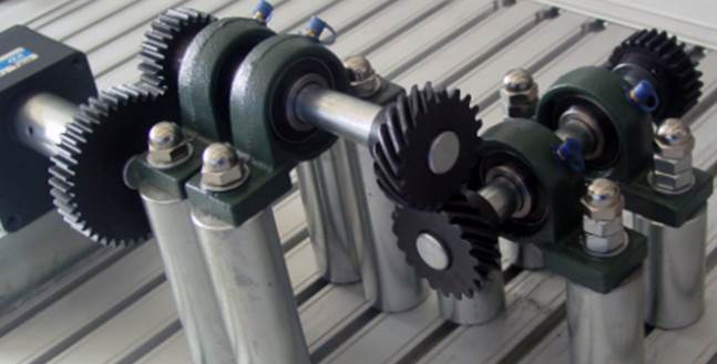 在這個實驗中,將執(zhí)行安裝步驟和校準(zhǔn)斜齒圓柱齒輪傳動系統(tǒng),(圖4-4的傳動機構(gòu)的搭建和校準(zhǔn)見實驗三、直齒圓柱齒輪);