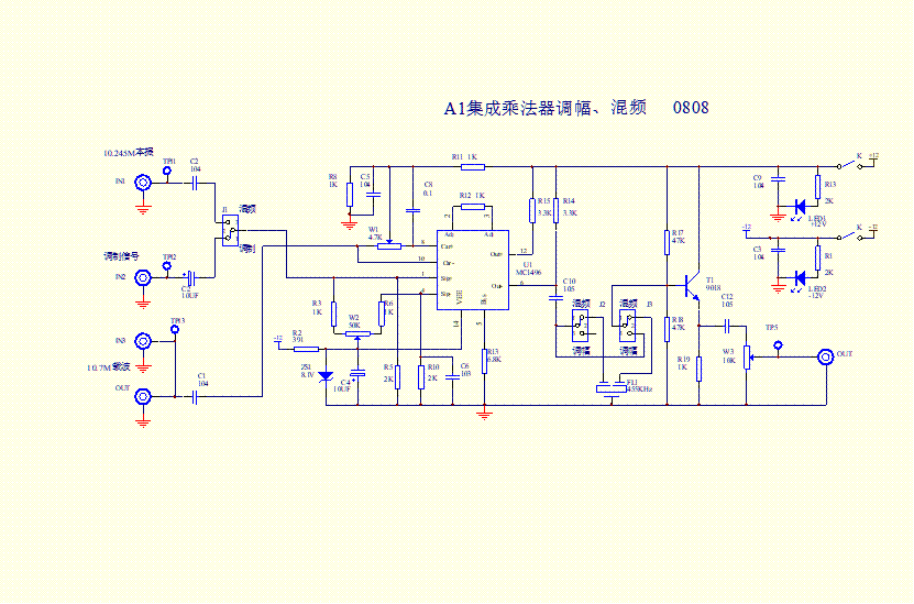 在IN3端加入載波信號(hào),(IN2調(diào)制信號(hào)暫不加),TPI3點(diǎn)監(jiān)測幅度。調(diào)節(jié)W2使OUT端輸出電壓幅度最小。在IN2端加入調(diào)制信號(hào),(載波信號(hào)暫不加),TPI2點(diǎn)監(jiān)測幅度。調(diào)節(jié)W1使輸出電壓幅度最小。反復(fù)進(jìn)行上述調(diào)整,使OUT端輸出電壓幅度達(dá)到最小。