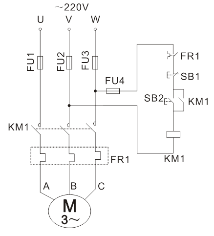 按圖5-6接線。圖中SB1、KM1、FU1、FU2、FU3、FU4為掛件GDQ39-1上的器件,電機(jī)選用DQ10(△/220V)。接線時(shí),先接主電路,它是從220V三相交流電源的輸出端U、V、W開始,經(jīng)熔斷器FU1、FU2、FU3、接觸器KM1主觸點(diǎn)到電動(dòng)機(jī)M的三個(gè)線端A、B、C的電路,用導(dǎo)線按順序串聯(lián)起來,有三路。主電路經(jīng)檢查無誤后,再接控制線路,從熔斷器FU4插孔W開始,經(jīng)按鈕SB1常開、接觸器KM1線圈到插孔V。線路接好經(jīng)指導(dǎo)老師檢查無誤后,按下面步驟進(jìn)行實(shí)訓(xùn):