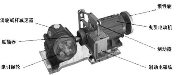 曳引機分為有齒輪曳引機和無齒輪曳引機兩種。有齒輪曳引機廣泛應用在運行速度V<2.0m/s的各種電梯上。本教學電梯即為有齒輪曳引機,它采用蝸輪減速傳動機構(gòu)。主要由曳引電動機、蝸輪蝸桿減速機、聯(lián)軸器、制動器、制動電磁鐵、曳引繩輪、慣性輪等構(gòu)成,其外形如圖所示。