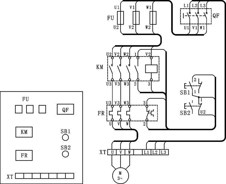 接線時動力電路用黑色線,控制電路用紅色線;啟動按鈕SB1用綠色,停止按鈕SB2用紅色。安裝接線后應(yīng)符合第二章的要求。