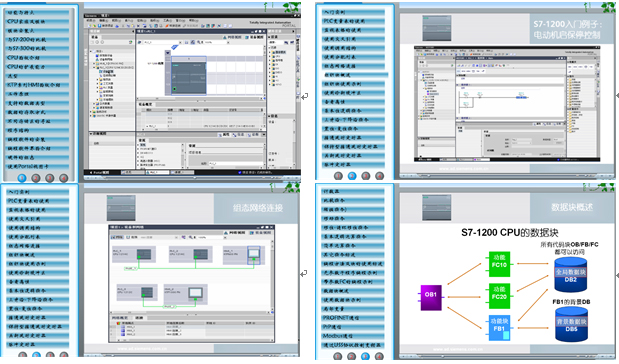 配有S7-1200 PLC學習軟件,方便老師教學,提供有功能與特點、模塊安裝、選型、工作原理、支持的數(shù)據(jù)類型、數(shù)據(jù)的存取方式、程序結構、編程軟件的安裝、編程軟件界面介紹、硬件的組態(tài)、入門實例、PLC變量表的使用、使用交叉引用、組織塊使用示例、基本位邏輯指令、上升沿-下降沿指令、置位-復位指令、接通延時定時器、比較指令、移位-循環(huán)移位指令、基本邏輯運算指令、數(shù)據(jù)塊概述等50多個學習項目。PLC學習軟件參考界面如下: