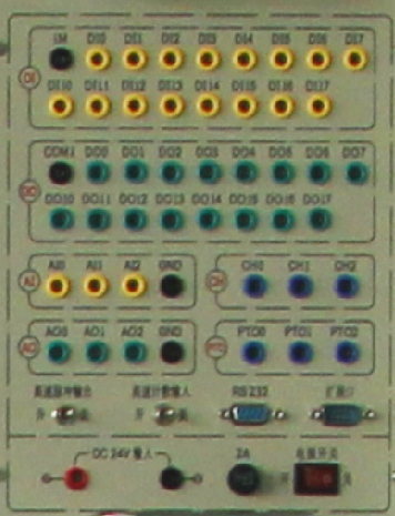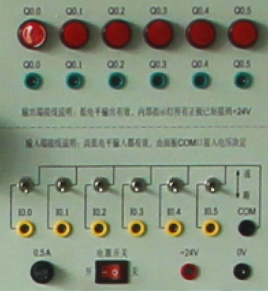 提供6路輸入、6路輸出等接口,輸入、輸出端電壓可自由切換0V和24V,輸出端由指示燈的亮滅來指示PLC輸出口的狀態(tài),面板印有清晰的說明和端口絲印。通過基本指令練習,讓學生掌握PLC輸入、輸出的外圍接線和工作原理。