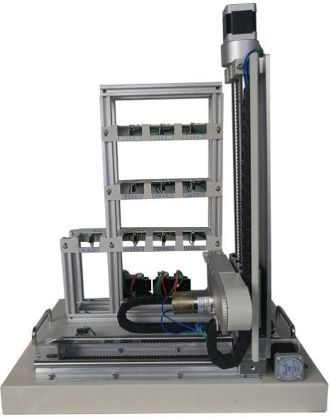 | 1.17 | 立體倉庫控制系統(tǒng) | 模型包含三層九倉位庫體、出/入庫倉位庫體、三維(X、Y、Z)運動機械及電氣控制等部分組成;定位執(zhí)行機構由豎軸和橫軸組成;驅動機構由步進電機及步進電機驅動器組成;傳動軸為滾珠絲桿傳動和雙軸導軌帶傳動,傳動平穩(wěn)。取物軸由直流減速電機驅動,可實現(xiàn)前后兩方向的運動。 |