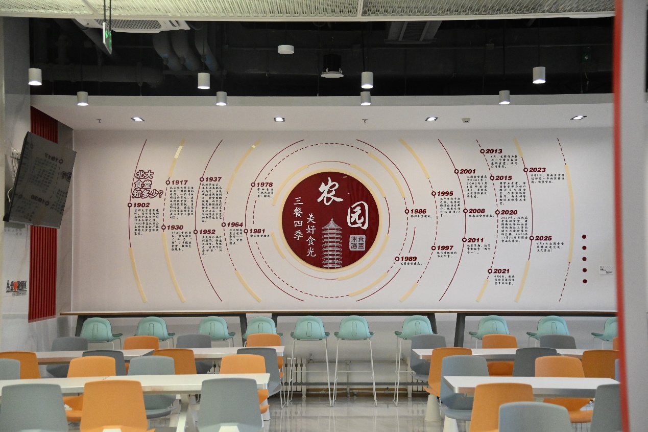 農(nóng)園食堂是教學(xué)區(qū)最大的食堂,本次工程是農(nóng)園食堂自2002年建成投入使用以來(lái)首次大規(guī)模更新改造,涉及基建改造、設(shè)備更新及軟裝配套等。改造工作自2024年7月啟動(dòng)以來(lái),陸續(xù)完成基建更新、新舊設(shè)備周轉(zhuǎn)安裝、米飯生產(chǎn)線重啟、智能結(jié)算系統(tǒng)部署、風(fēng)味檔口籌備、保潔團(tuán)隊(duì)選聘、消防物業(yè)協(xié)調(diào)、伙食菜品規(guī)劃、藝園食堂周轉(zhuǎn)等。在軟裝配套上延續(xù)“師生共建”方式,邀請(qǐng)校園公益營(yíng)建社、城市與環(huán)境學(xué)院、現(xiàn)代農(nóng)學(xué)院及現(xiàn)代農(nóng)業(yè)研究院對(duì)公共空間進(jìn)行設(shè)計(jì)。文化墻以北大餐飲歷史為脈絡(luò),串聯(lián)農(nóng)時(shí)節(jié)氣與農(nóng)事記憶,營(yíng)造清新雅致的就餐氛圍。同時(shí),食堂還利用公共空間設(shè)立臨展區(qū),首期展覽以現(xiàn)代農(nóng)學(xué)院及現(xiàn)代農(nóng)業(yè)研究院的科研成果展示為主。