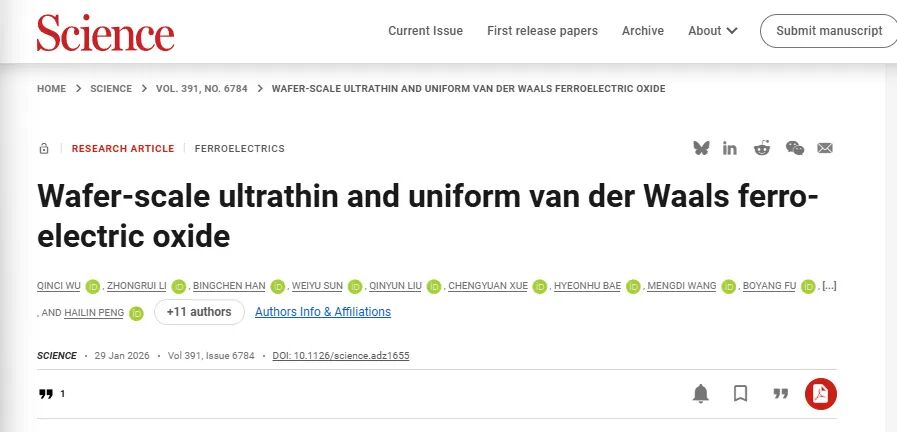 彭海琳團隊在Science上發(fā)表了一篇研究長文,文章標題為“Wafer-scale ultrathin and uniform van der Waals ferroelectric oxide”。他們成功研制出一種名為“α-硒酸鉍”的新型高介電常數(shù)范德華鐵電材料,攻克了兼容現(xiàn)有芯片工藝的晶圓級超薄膜制備難題。