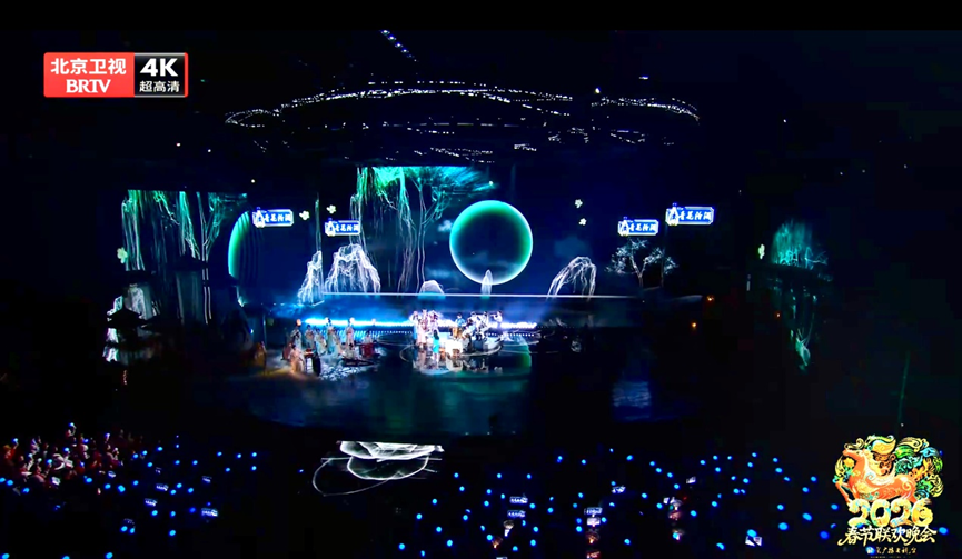 2026-02-26 08:03在2月17日播出的北京廣播電視臺春節(jié)聯歡晚會上,我校文化與傳媒學院藝術系教師戴硯亮創(chuàng)作的數字藝術作品《長林下・萬木影》,在經典民歌改編節(jié)目《茉莉花》中驚艷呈現。節(jié)目里,舞蹈演員們各具風韻的精彩演繹,與背景屏幕上東方意境十足的數字視覺交相輝映,讓茉莉花開在詩意光影之中,傳統民歌與當代數字藝術完美交融。