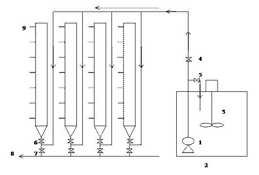 實驗裝置,每根沉淀柱在高度方向每隔150~250mm開設一取樣口,柱上部設溢流孔。將懸浮物濃度及水溫已知的水樣注入沉淀柱,攪拌均勻后開始計時,每隔20min、40 min、60 min、……分別在每個取樣口同時取樣50~100mL,測定其懸浮物濃度并利用下式計算各水樣的去除率。