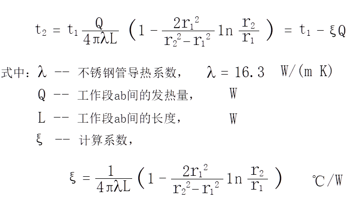 試件為圓管時,按有內(nèi)熱源的長圓管,其管外表面為對流放熱條件,管內(nèi)壁面絕熱時,根據(jù)管壁溫度可以計算外壁溫度: