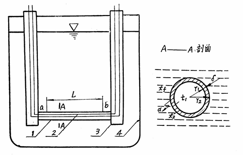 管子的發(fā)熱量電流過它的電流及其工作段的電壓降來確定。為排除試件端部的影響,在a、b兩點測量工作段的電壓降,以確定通過a、b之間表面的散熱量Q。試件外壁溫度t2,很難直接測定,對不銹鋼管試件,可利用插入管內(nèi)的銅——康銅熱電偶2測出管內(nèi)壁溫度t1,再通過計算求出t2。