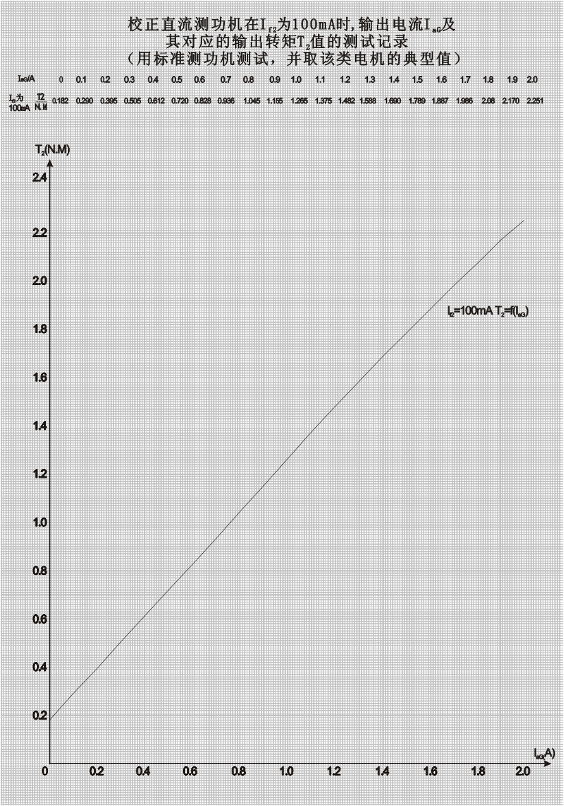 1、IaG-T2曲線是DQ19校正直流測功機的勵磁電流固定在100mA時利用專用轉矩儀校正而來的,用戶在使用過程中,對應于DQ19校正直流測功機的勵磁電流為100mA時任意電樞電流IaG查找對應的轉矩T2即為電動機的輸出轉矩。