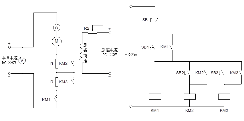 除以上用時(shí)間繼電器控制直流電動(dòng)機(jī)的調(diào)速外,還可以用繼電接觸器控制電機(jī)的調(diào)速,電路圖如下,試分析其工作過(guò)程:
