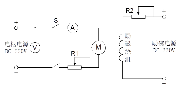 按下控制屏上的“啟動(dòng)”按鈕,打開(kāi)電樞電源開(kāi)關(guān),調(diào)節(jié)電樞電源的“電壓調(diào)節(jié)”旋鈕,使直流電樞電壓輸出為220V,按下“停止”按鈕。按圖5-5接線,圖中電阻R1為DQ29上180Ω并將其為最大位置,R2為DQ29上1800Ω阻值并將其置最小位置,S選用屏上雙刀雙擲開(kāi)關(guān),開(kāi)始時(shí)處于斷開(kāi)狀態(tài)。