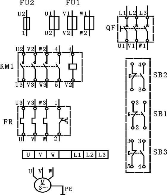 接線時(shí)動(dòng)力電路用黑色線,控制電路用紅色線;啟動(dòng)按鈕SB2用綠色,停止按鈕SB1用紅色,點(diǎn)動(dòng)控制按鈕SB3用黑色。安裝接線后應(yīng)符合第二章的要求。