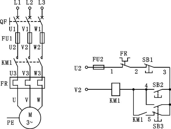 確認(rèn)接線正確后,接通交流電源L1、L2、L3并“合”開關(guān)QF,按下SB2,電機(jī)應(yīng)起動(dòng)并連續(xù)轉(zhuǎn)動(dòng),按下SB1電機(jī)應(yīng)停轉(zhuǎn)。按下SB3,電動(dòng)機(jī)運(yùn)行,松開SB3,電動(dòng)機(jī)停轉(zhuǎn)。