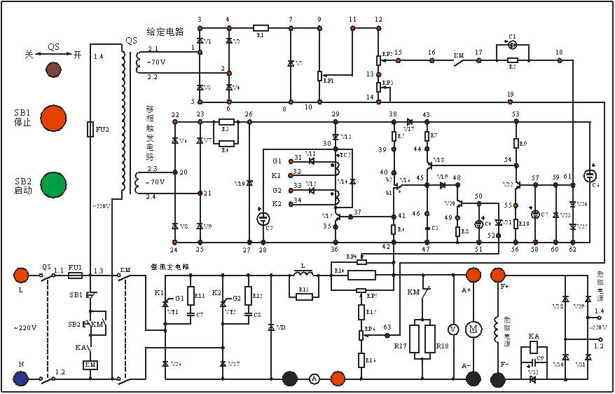 按下SB1(停止按鈕),斷掉晶閘管主電路的電源。在晶閘管主電路中,70、71之間的KM的常閉觸點閉合,電阻R16和R17與電樞并聯(lián)形成能制動的回路,加速直流電動機的制動。