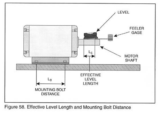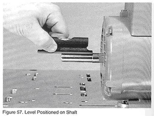 A.將水平儀放置在電機(jī)軸上,如圖57所示,觀察氣泡的位置。務(wù)必使得水平儀放置在軸的光滑表面上,一些軸是階梯軸,所以水平儀必須放置在其中一段上面,如圖57所示。