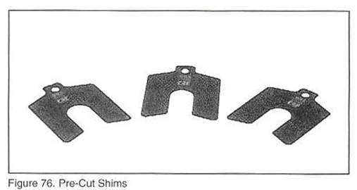 H.在電機(jī)的兩只腳下插入相應(yīng)厚度的調(diào)整墊片(按步驟F中所計(jì)算出的墊片厚度),前兩只或者后兩只都可以,這樣可以使得軸上的水平儀氣泡處于中心位置。采用如圖59所示調(diào)整墊片,它們放在儲(chǔ)物柜的抽屜1中。