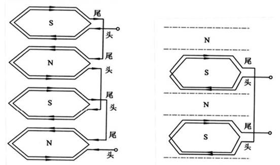 · 極相組的連接。在一個(gè)極下的,屬于同一相的所有線圈串聯(lián)在一起,稱為一個(gè)極相組。為了保證三相電動(dòng)機(jī)線圈連接之后,能形成 N 極和 S 極相間的排列,各極相組之間的連接,必須是頭頭相拉,如圖 5-1(a)所示。但也有如圖 5-1(b)所示的頭尾相接,這時(shí)可以看到,同樣是四極三相電動(dòng)機(jī),它只有兩個(gè)極相組,因而它必須是頭尾相接,才能形成四極的磁場(chǎng),但此種接法通常用于單繞組多速三相電動(dòng)機(jī)。在中小型電動(dòng)機(jī)中,一個(gè)極相組內(nèi)的線圈一般是連續(xù)繞制的,因此不用接頭。