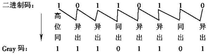 假如要把二進(jìn)制碼10110110轉(zhuǎn)換成格雷碼,則可以通過下面的方法來完成,方法如圖4-2-1。