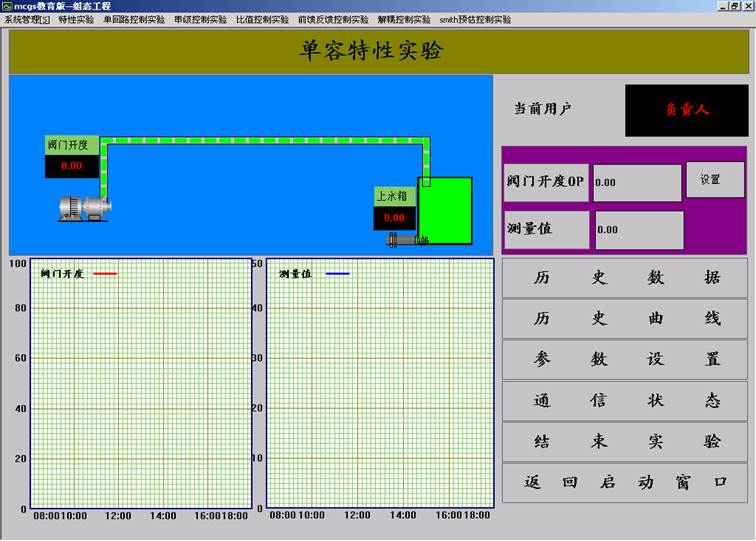 8.點(diǎn)擊“確認(rèn)”,用戶登錄完畢。選擇“特性實(shí)驗(yàn)”下拉菜單中的“上水箱單容特性實(shí)驗(yàn)”。如圖2.1.6所示。