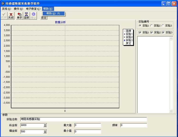 2、點(diǎn)擊[打開]按鈕,設(shè)置好實(shí)驗(yàn)名稱,然后點(diǎn)擊[單步]或[連續(xù)]按鈕進(jìn)行數(shù)據(jù)采集,點(diǎn)擊[關(guān)閉]按鈕停止采樣,點(diǎn)擊[保存]按鈕保存實(shí)驗(yàn)數(shù)據(jù),點(diǎn)擊[裝載文件]按鈕打開已保存的數(shù)據(jù)文件,點(diǎn)擊[打印]按鈕打印預(yù)覽裝載的文件。